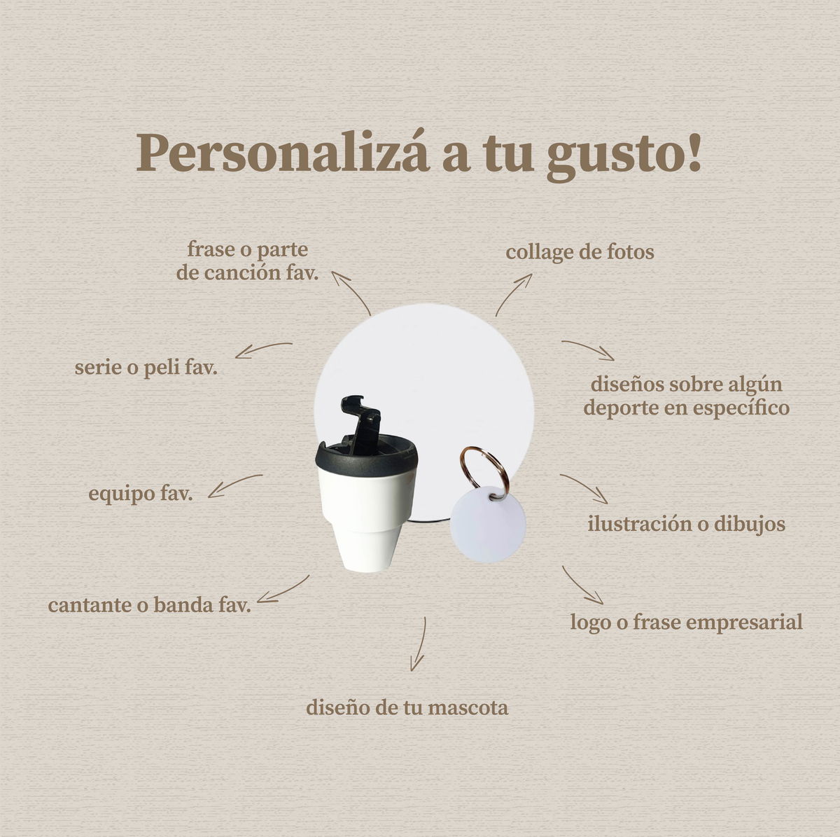 Tu café, tu espacio de trabajo y tus llaves… todo puede tener tu toque personal. Este combo es ideal para quienes aman los detalles: frases motivadoras, personajes, escudos, logos o colores que te identifican. Perfecto para regalar o para arrancar el día con actitud.
