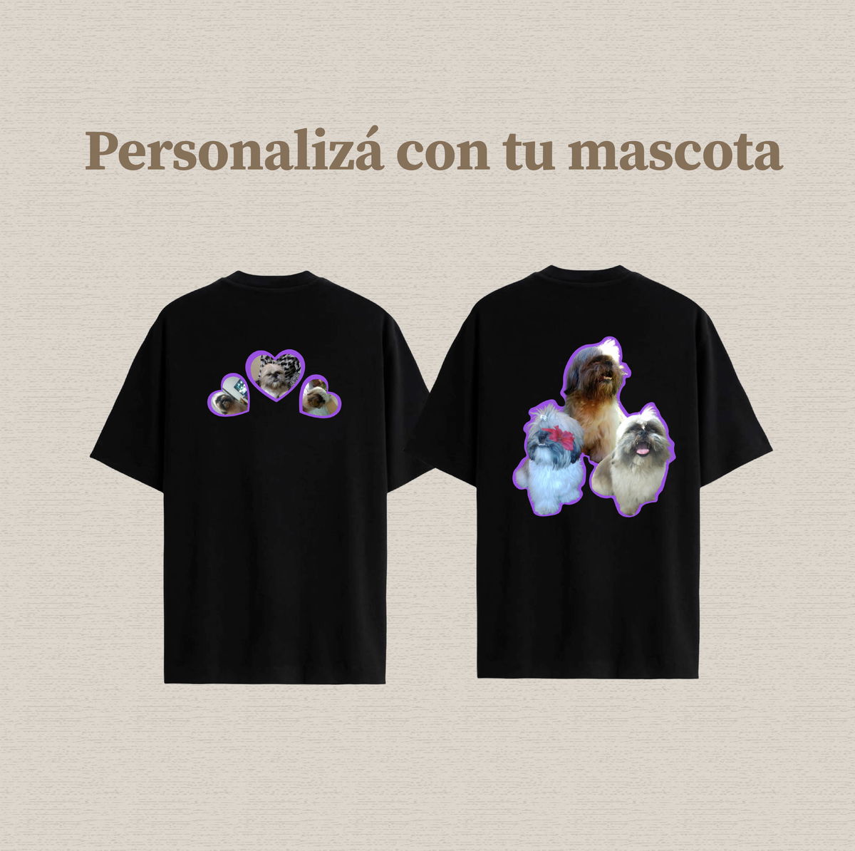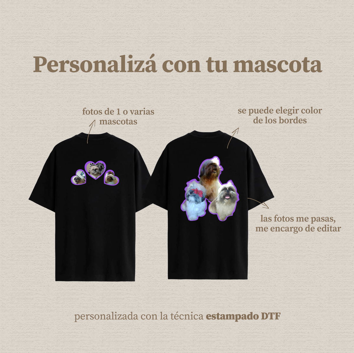 ✨ Creo remeras que celebran el amor por tu mascota. Vos me mandás tus fotos favoritas, y las edito cuidadosamente para armar un diseño personalizado, listo para estampar en tu prenda. Ideal para regalarte, sorprender a alguien especial o recordar para siempre a ese compañero fiel. ¡Convertí a tu mascota en protagonista!