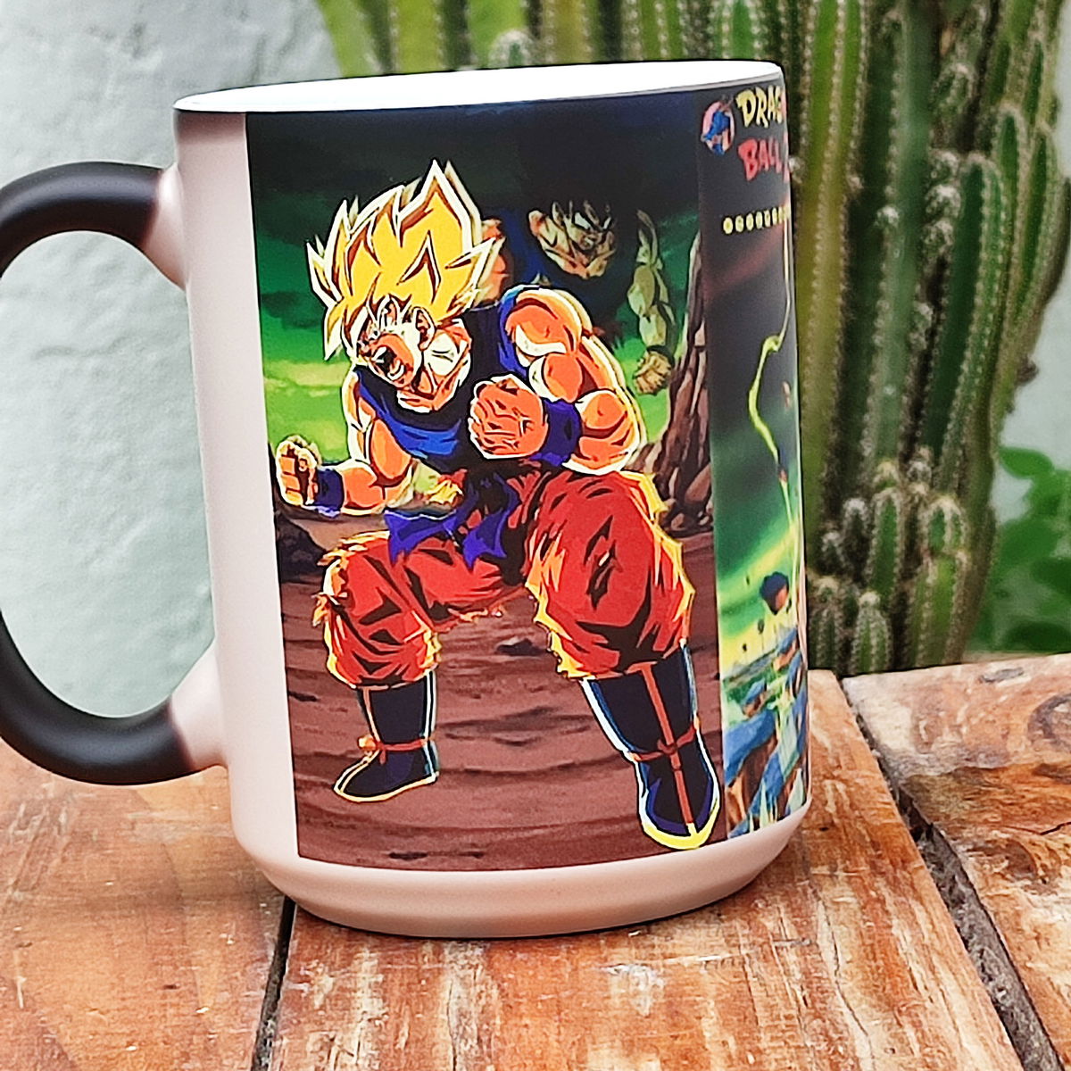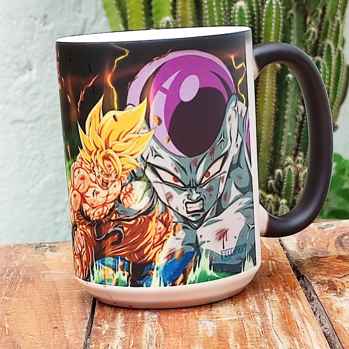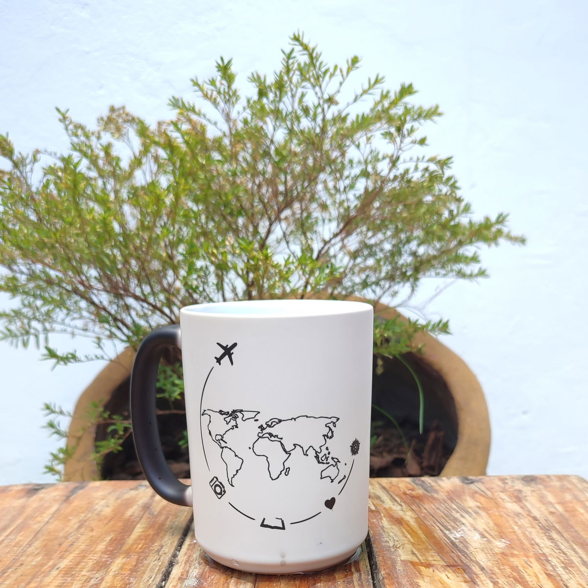 Es una taza negra que al colocar el líquido caliente aparece la imagen o el diseo sublimado en la taza, luego de lavar o de enfriarse se vuelve negra nuevamente.