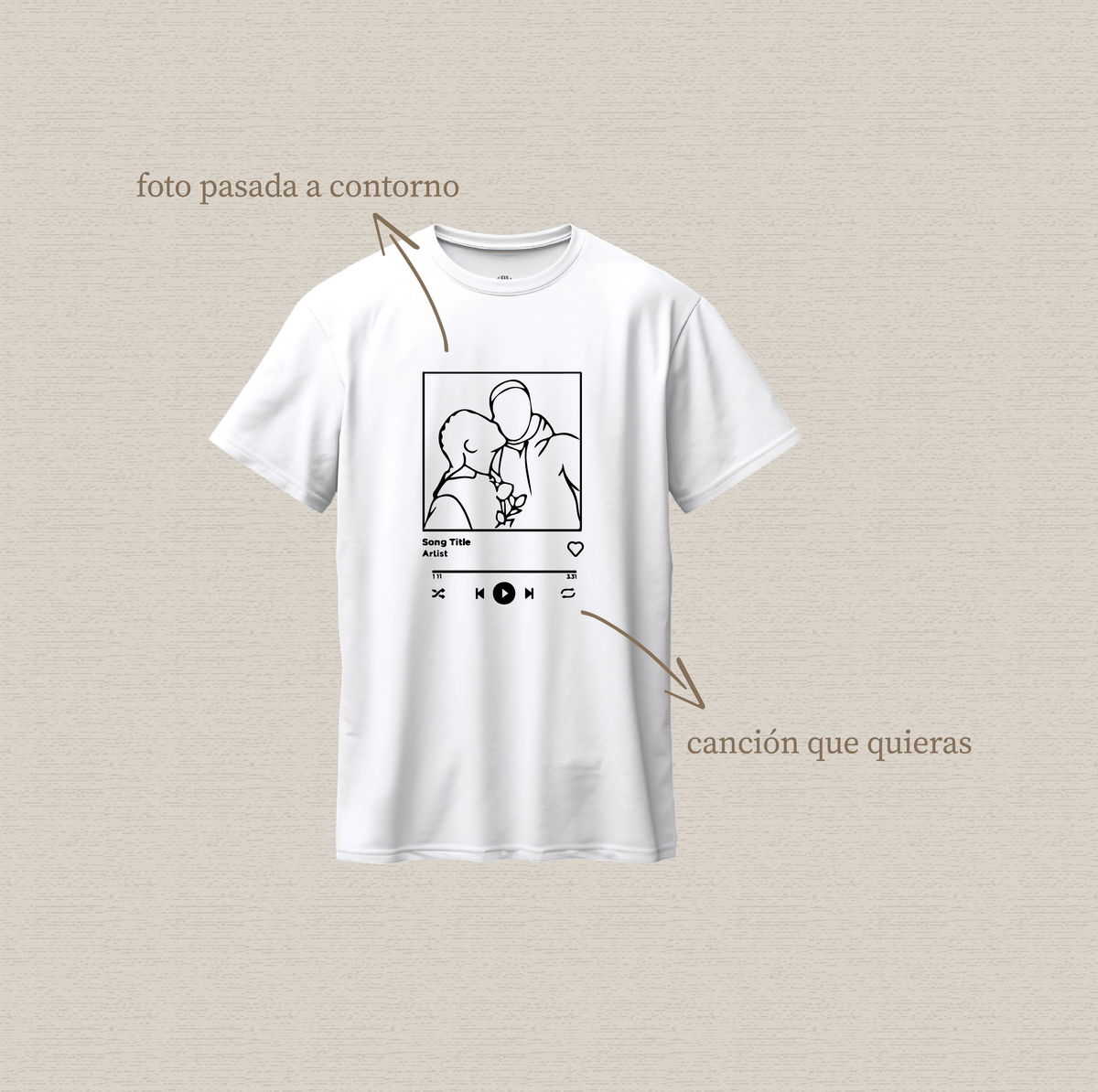 Remera de algodón estampada personalizada con diseño "foto pasada a contorno+canción"