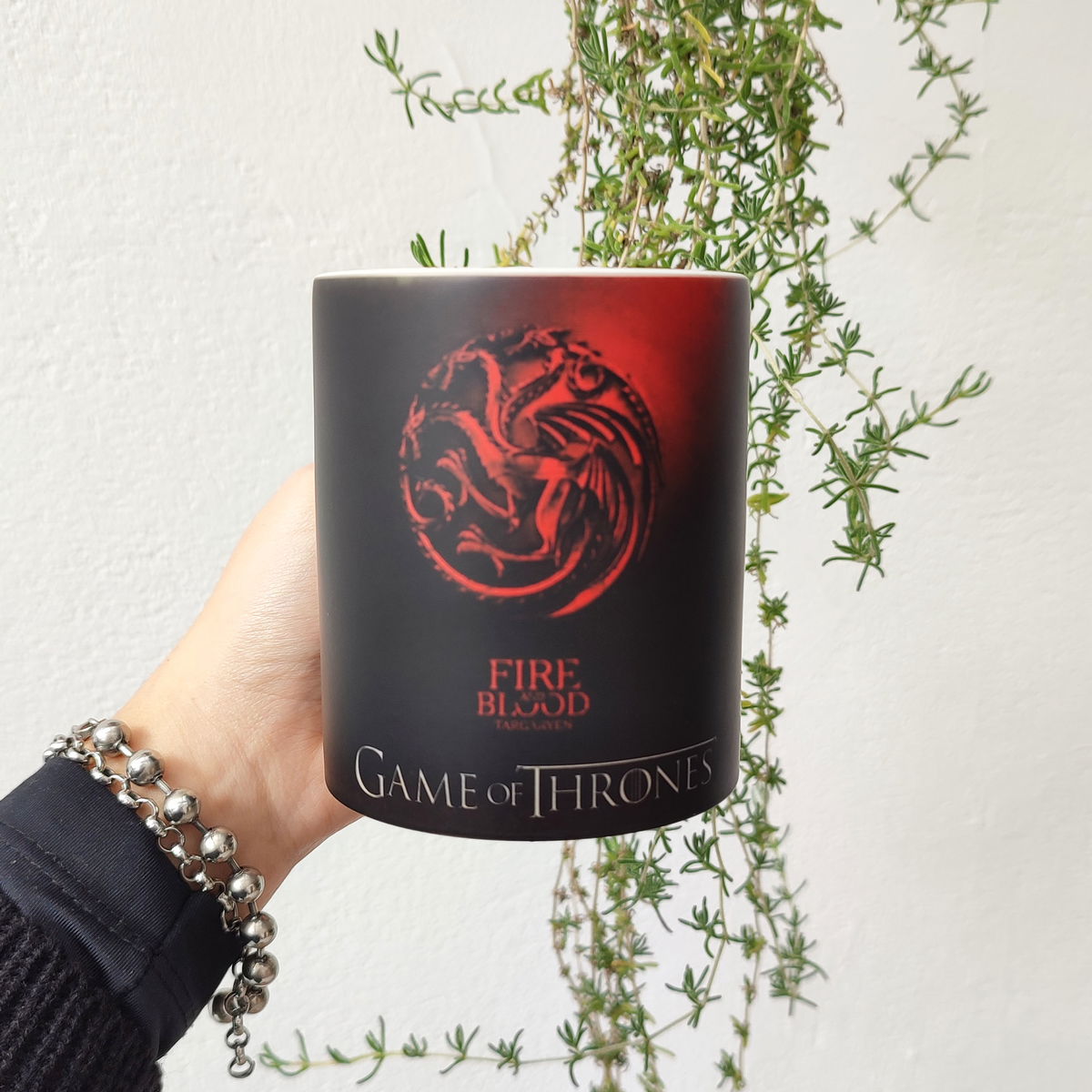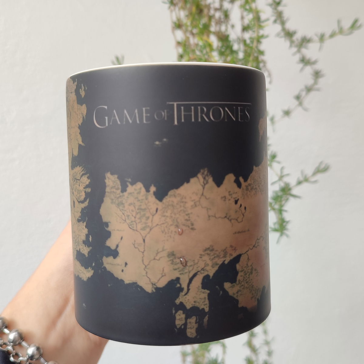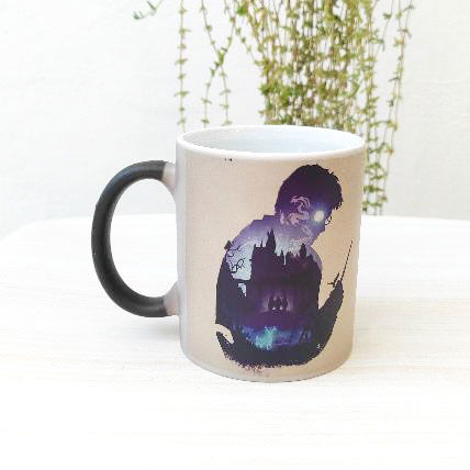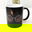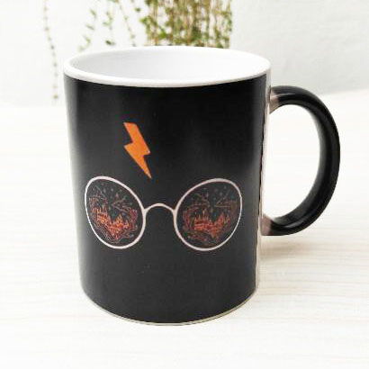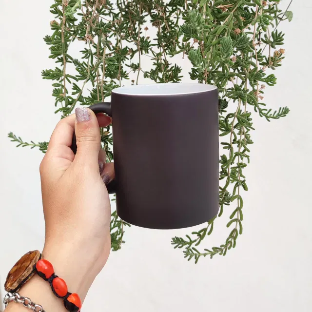 Es una taza negra que al colocar el líquido caliente aparece la imagen o el diseo sublimado en la taza, luego de lavar o de enfriarse se vuelve negra nuevamente.